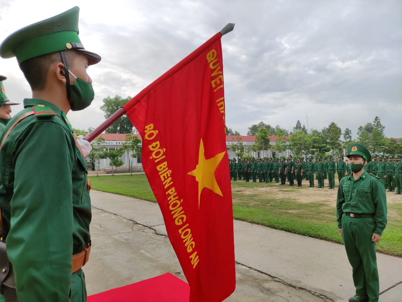 Cùng với đó là nghi thức hôn lên Quân kỳ Quyết thắng và nghi thức trao nhận vũ khí. Đây là giây phút thiêng liêng, người chiến sĩ nhận vũ khí từ người chỉ huy cao nhất, chính thức thực hiện nhiệm vụ bảo vệ Tổ quốc, đánh dấu một sự kiện lớn lao trong cuộc đời mỗi chiến sĩ. Sau giây phút nhận vũ khí, người chiến sĩ hô to: “Quyết tâm bảo vệ vững chắc Tổ quốc Việt Nam xã hội chủ nghĩa”, phía dưới hàng quân, tất cả đồng thanh “Quyết tâm…Quyết tâm…quyết tâm”. Ba tiếng “Quyết tâm” đồng loạt vang lên, những cảm xúc hòa cùng khí thế sôi nổi,quyết liệt càng làm tăng gấp bội tinh thần cách mạng, lòng nhiệt huyết và sự mong muốn cống hiến của tuổi trẻ Tiểu đoàn Huấn luyện -Cơ động, BĐBP tỉnh Long An. Từ đây, tất cả chiến sĩ phải ý thức, tự giác, trách nhiệm trọn đời với lời thề thiêng liêng đã hứa.