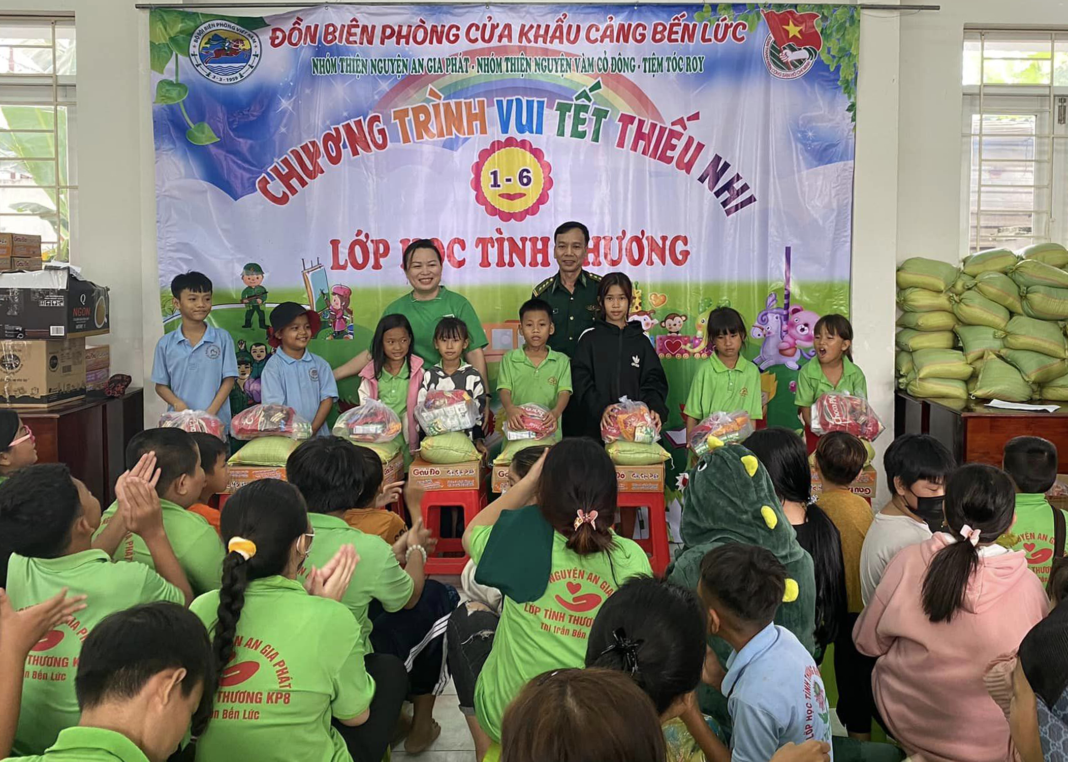 Đồn Biên phòng Cửa khẩu cảng Bến Lức phối hợp tặng quà các em học sinh lớp học tình thương